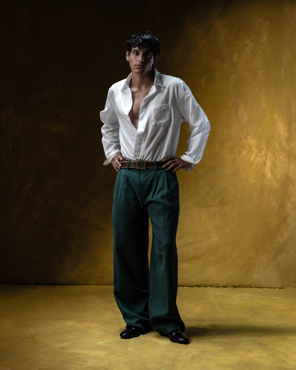 Calca de alfaiataria com aviamentos personalizados em prata velho.